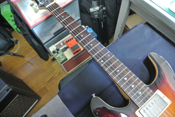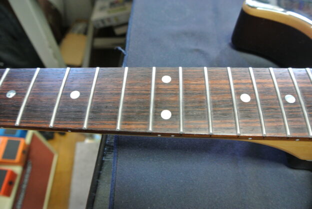 インレイステッカーのおかげで12フレット近辺が見えやすくなり、かなり快適に弾けるギターになりました。貝殻素材のインレイが見えにくい場合は、インレイを打ち直すか、このようにステッカーを貼るなどしてみてはいかがでしょうか?